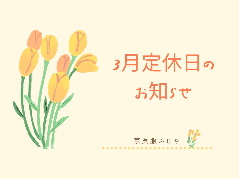 「京呉服 ふじや」3月の定休日となります。 3月4日(水)・5日(木) 3月11日(水)・12日(木) 3月18日(水)・19日(木) 3月25日(水)・26日(木) ご来店をご予定のお客様はお間違えの無いようにお気を付 […] -